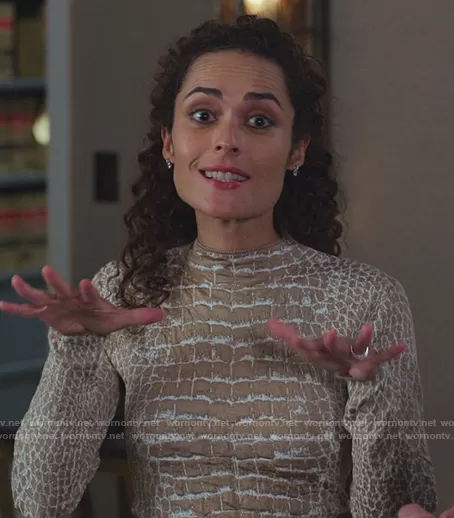 (played by ) on The Good Fight on CBS was spotted wearing this beige crocodile print top on The Good Fight on episode 'And the Firm Had Two Partners' (5x05) in Jul 2021. 's Top is the Fabricia Croc Print Top by Boss.