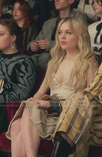 Audrey Hope (played by Emily Alyn Lind) on Gossip Girl on HBO Max was spotted wearing this beige midi dress on Gossip Girl on episode 'Lies Wide Shut' (1x03) in Jul 2021. Audrey's Dress is the La robe Valerie Corset Midi Dress by Jacquemus.