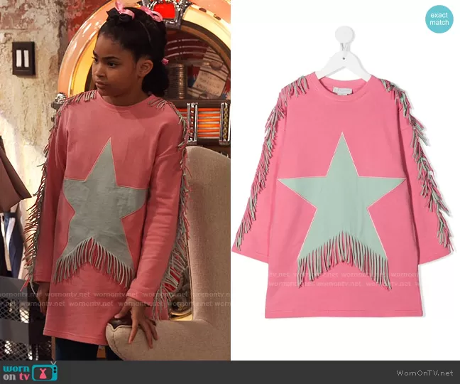 Millicent (played by Jaidyn Triplett) on iCarly on Paramount+ was spotted wearing this pink fringed star dress on iCarly on episode 'iLove Gwen' (1x08) in Jul 2021. Millicent's Dress is the Star Motif Fringed Dress by Stella McCartney.