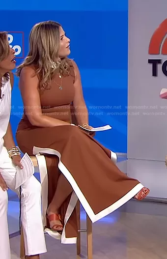 Jenna Bush Hager on Today on NBC was spotted wearing this brown sleeveless slit dress on Today on Aug 30 2021's episode. Jenna's Dress is the Noir Contrast Trim Mock Neck Maxi Dress by Staud.