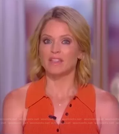 Sara Haines on The View on ABC was spotted wearing this orange sleeveless polo top on The View on Jul 23 2021's episode. Sara's Top is the Asher Top in Orange by A.L.C..