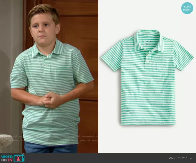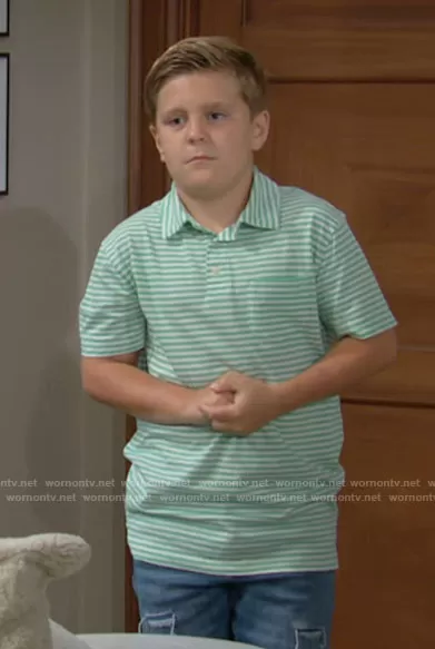 (played by ) on The Young and the Restless on CBS was spotted wearing this green striped polo shirt on The Young and the Restless on Jul 23 2021's episode. 's Shirt is the Boys Polo Shirt in Ivory Green Stripe by J. Crew.