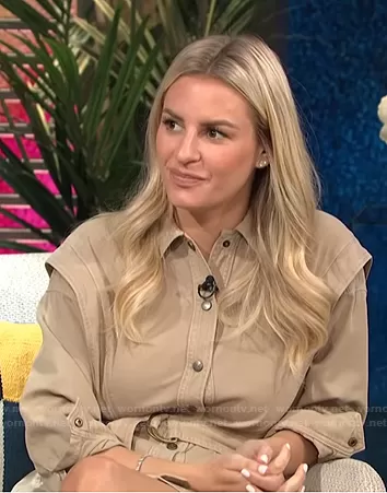 Morgan Stewart on E! News on E! was spotted wearing this beige belted shirtdress on E! News Daily Pop on Jul 23 2021's episode. Morgan's Dress is the Jeanne Belted Mini Shirt Dress by Noam.