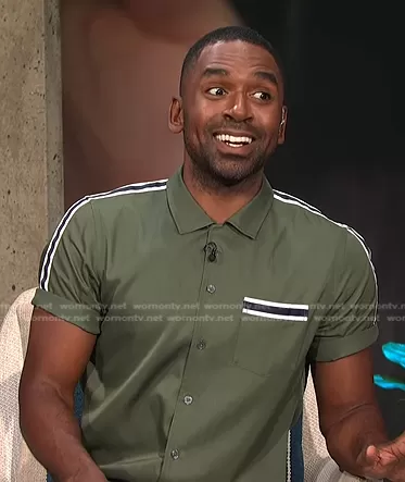 Justin Sylvester on E! News on E! was spotted wearing this green striped shoulder shirt on E! News Daily Pop on Mar 29 2022's episode. Justin's Shirt is the Japanese Shoulder Stripe Rayon Shirt by Todd Snyder.