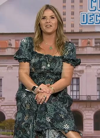 Jenna Bush Hager on Today on NBC was spotted wearing this floral puff sleeve dress on Today on Oct 07 2021's episode. Jenna's Dress is the Iliana Puff Sleeve Midi Dress by Ulla Johnson.