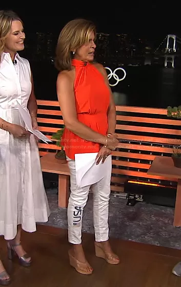 Hoda Kotb on Today on NBC was spotted wearing this red halter top and white USA print jeans on Today on Jul 26 2021's episode. Hoda's Top is the Fluid Crepe Halter Top by Lela Rose . Hoda's Pants is the Tompkins Super-Skinny Jeans in White by Polo Ralph Lauren x Team USA.