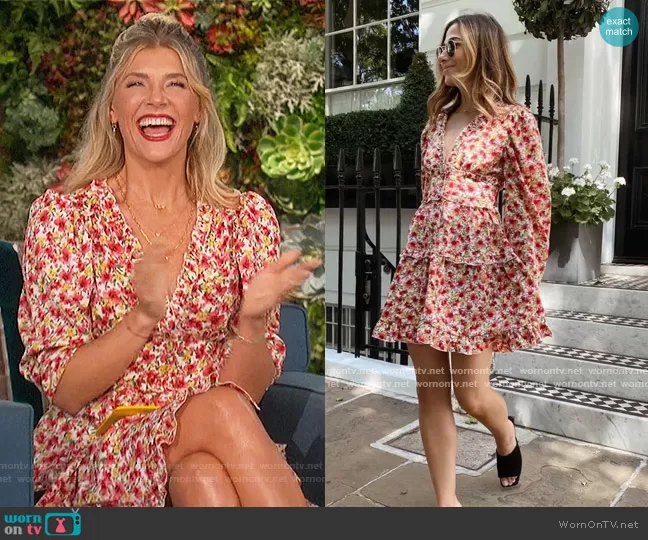 Amanda Kloots on The Talk on CBS was spotted wearing this floral print ruffle mini dress on The Talk on Jul 26 2021's episode. Amanda's Dress is the The Loren Dress by Spring Time in Brooklyn.