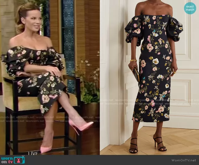 on Live with Kelly and Mark on Disney ABC Home Entertainment was spotted wearing this black floral off-shoulder dress on Live with Kelly and Ryan on Jul 27 2021's episode. 's Dress is the Off-the-Shoulder Floral-Print Dress by Monique Lhuillier.