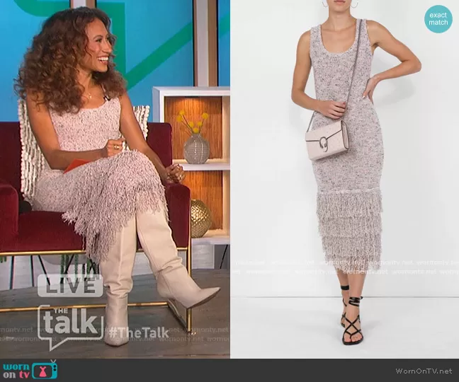Elaine Welteroth on The Talk on CBS was spotted wearing this marled fringe dress on The Talk on Jul 28 2021's episode. Elaine's Dress is the Sleeveless Midi Length Dress with Tiered Fringe by Cushnie.