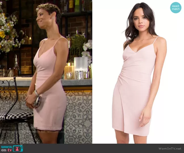 Elena Dawson (played by Brytni Sarpy) on The Young and the Restless on CBS was spotted wearing this blush pink mini dress on The Young and the Restless on Jul 28 2021's episode. Elena's Dress is the Esthero Dress in Bellini by Black Halo . Elena's Shoes is the Altina Ankle Strap Sandal by Schutz.