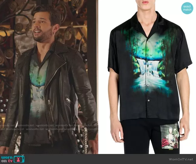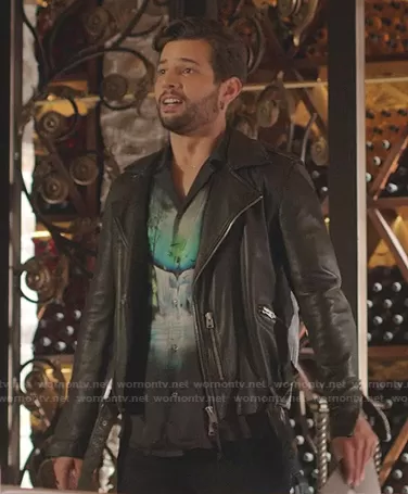 Sam Flores (played by Rafael de la Fuente) on Dynasty on The CW was spotted wearing this black waterfall print shirt and moto jacket on Dynasty on episode 'A Public Forum for Her Lies' (4x11) in Jul 2021. Sam's Shirt is the Waterfall Holiday Shirt by Off-White . Sam's Jacket is the Kaho Leather Biker Jacket by All Saints.