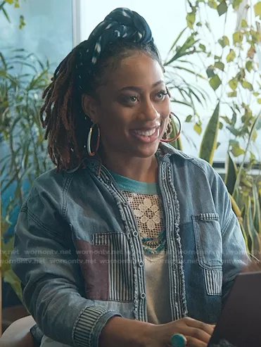 Malika Williams (played by Zuri Adele) on Good Trouble on Freeform was spotted wearing this patchwork denim shirt on Good Trouble on episode 'Making a Metamour' (3x13) in Jul 2021. Malika's Top is the Northbound Buttondown by Free People.