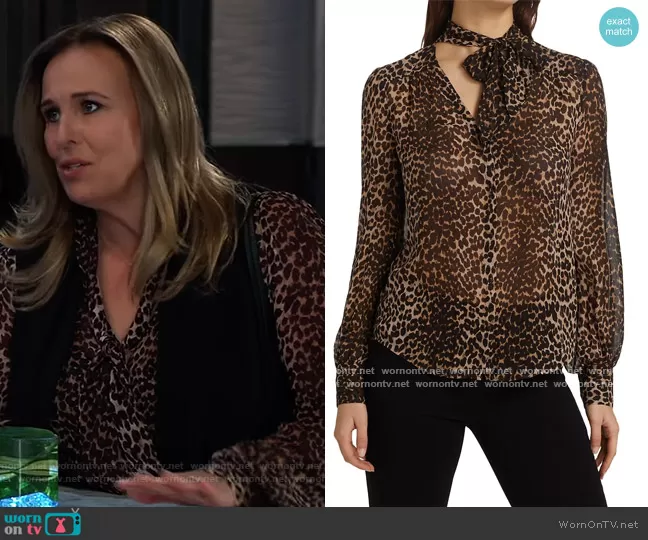 Laura Collins (played by Genie Francis) on General Hospital on ABC was spotted wearing this leopard print blouse on General Hospital on Mar 14 2025's episode. Laura's Top is the Cleobelle Leopard Print Silk Blouse by Paige .