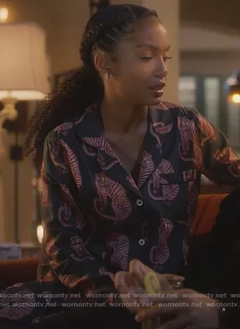 Zoey Johnson (played by Yara Shahidi) on Grown-ish on Freeform was spotted wearing this black tiger print pajamas on Grown-ish on episode 'Daddy Lessons' (4x04) in Jul 2021. Zoey's Pajamas is the Tiger-Print Classic Pajama Set by Desmond & Dempsey.