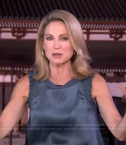 Amy Robach on Good Morning America on ABC was spotted wearing this navy ruffle sleeveless top on Good Morning America on Jul 30 2021's episode. Amy's Top is the Lenore Ruffle Silk Blouse by Cinq a Sept.