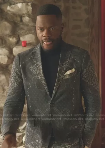 Jeff Colby (played by Sam Adegoke) on Dynasty on The CW was spotted wearing this paisley print blazer on Dynasty on episode 'Everything but Facing Reality' (4x12) in Jul 2021. Jeff's Jacket is the Paisley-Print Single-Breasted Blazer by Etro . Jeff's Pants is the Paisley-Print Trousers by Etro . Jeff's Belt is the Double Gancini Buckle Reversible Leather Belt by Salvatore Ferragamo.