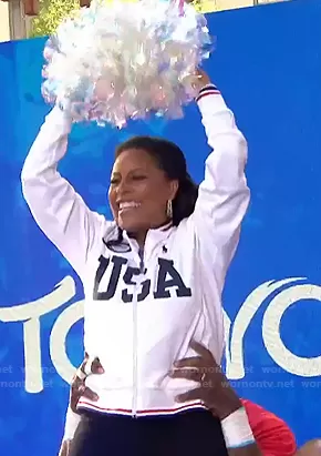 Sheinelle Jones on Today on NBC was spotted wearing this white USA track jacket on Today on Aug 02 2021's episode. Sheinelle's Jacket is the Team USA Bomber Track Jacket by Polo Ralph Lauren.