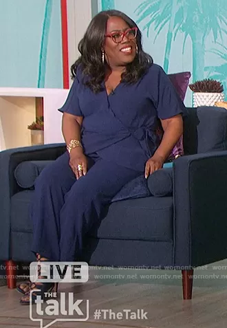 Sheryl Underwood on The Talk on CBS was spotted wearing this navy wrap top and pants on The Talk on Aug 02 2021's episode. Sheryl's Top is the Astro Wrap Surplice Top by Trina Turk . Sheryl's Pants is the Exit Crepe Ankle Pants by Trina Turk.