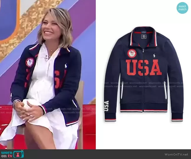 Dylan Dreyer on Today on NBC was spotted wearing this navy USA track jacket on Today on Aug 02 2021's episode. Dylan's Jacket is the Team USA Track Jacket by Polo Ralph Lauren x Team USA.
