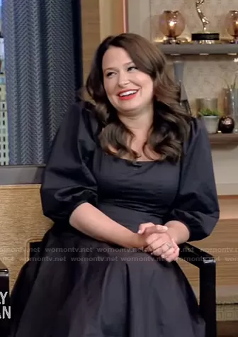 on Live with Kelly and Mark on Disney ABC Home Entertainment was spotted wearing this black puff sleeve midi dress on Live with Kelly and Ryan on Aug 02 2021's episode. 's Dress is the Swells Fit & Flare Midi Dress by Staud.