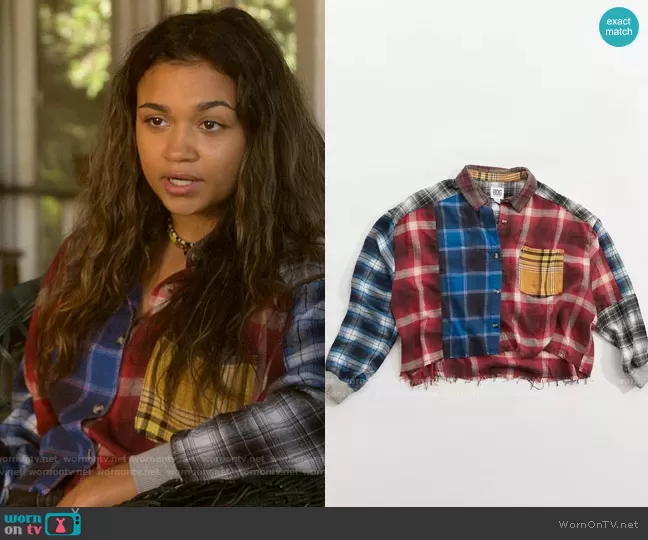 Kiara Carrera (played by Madison Bailey) on Outer Banks on Netflix was spotted wearing this patchwork plaid shirt on Outer Banks on episode 'The Bonfire' (2x07) in Aug 2021. Kiara's Top is the Rayne Patchwork Flannel Shirt by BDG at Urban Outfitters.
