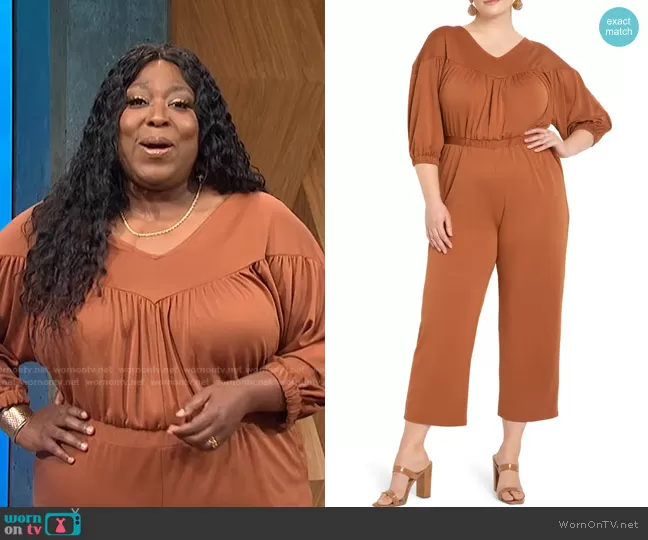 Loni Love on E! News on E! was spotted wearing this brown gathered jumpsuit on E! News Daily Pop on Aug 03 2021's episode. Loni's Jumpsuit is the Gathered Yoke Piqué Jumpsuit by Eloquii.