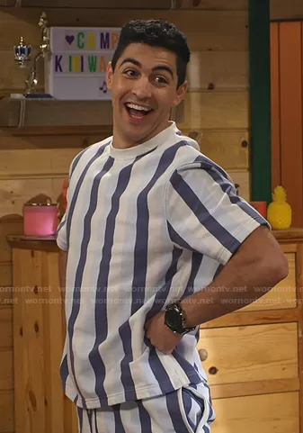 Parker Preston (played by Trevor Tordjman) on Bunkd on Disney was spotted wearing this striped sweatshirt and shorts on Bunkd on episode 'Moose Queens and Possum Kings' (5x20) in Aug 2021. Parker's Sweater is the Short Sleeve Striped Sweatshirt by Topman . Parker's Shorts is the Stripe Drawstring Knit Shorts by Topman.