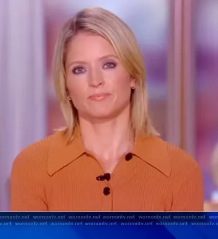 Sara Haines on The View on ABC was spotted wearing this brown ribbed polo on The View on Aug 04 2021's episode. Sara's Top is the Hatti Rib Merino Wool Polo by Nanushka.