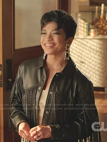 (played by ) on Dynasty on The CW was spotted wearing this black fringed leather jacket on Dynasty on episode 'Everything but Facing Reality' (4x12) in Jul 2021. 's Jacket is the Faux Leather Fringed Jacket by Zara . 's Earrings is the Florentina Earrings by Angelina Alvarez .