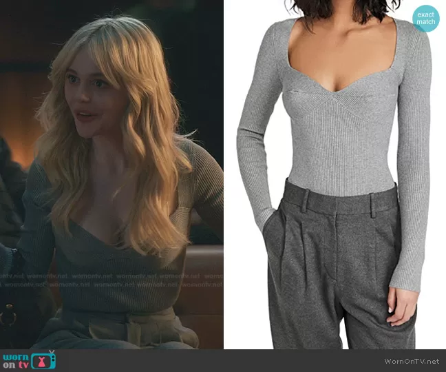Audrey Hope (played by Emily Alyn Lind) on Gossip Girl on HBO Max was spotted wearing this grey ribbed sweetheart top on Gossip Girl on episode 'Hope Sinks' (1x05) in Aug 2021. Audrey's Bodysuit is the Sweetheart Neckline Thong Bodysuit by Fleur Du Mal.