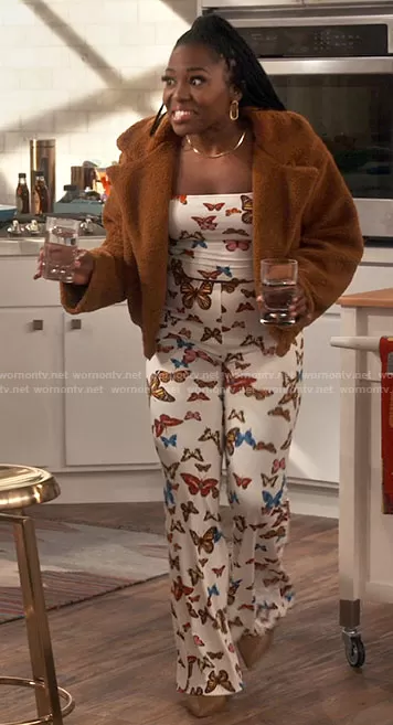 Harper (played by Laci Mosley) on iCarly on Paramount+ was spotted wearing this butterfly print top and pants set on iCarly on episode 'iTake a Girls' Trip' (1x10) in Aug 2021. Harper's Top is the Wings Of Change Butterfly Print Cami Crop Top from Dolls Kill . Harper's Pants is the Wings Of Change Butterfly Print Flares from Dolls Kill.