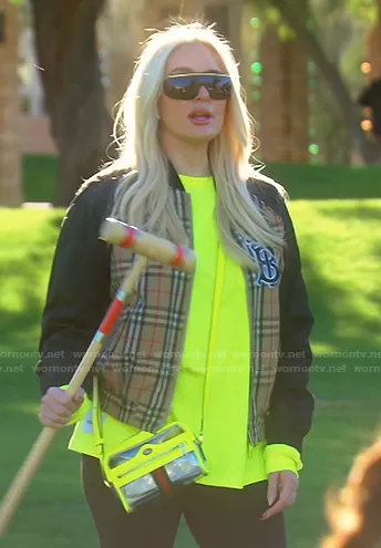 Erika Jayne on The Real Housewives of Beverly Hills on Bravo was spotted wearing this Erika beige plaid bomber jacket on The Real Housewives of Beverly Hills on episode 'Ice Queen of the Desert' (11x11) in Aug 2021. Erika's Jacket is the Monogram Motif Vintage Check Bomber Jacket by Burberry . Erika's Bag is the Ophida Transparent Cross-Body Bag by Gucci.