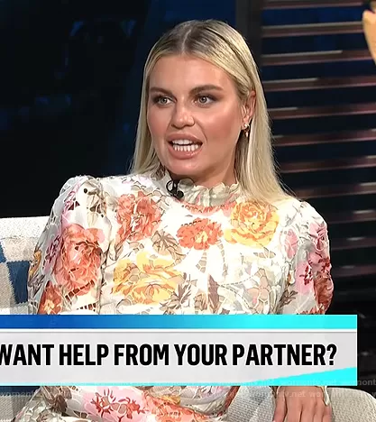 on E! News on E! was spotted wearing this floral print scallop trim dress on E! News Daily Pop on Aug 06 2021's episode. 's Dress is the Tessa Mini Dress by Elliatt.