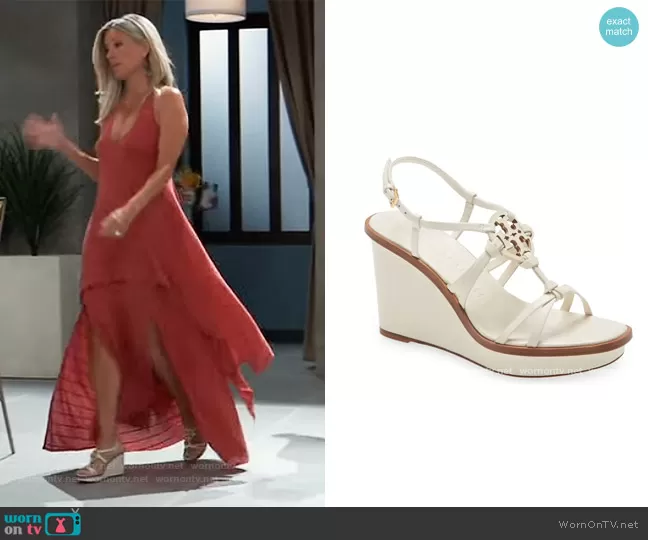 Carly Spencer (played by Laura Wright) on General Hospital on ABC was spotted wearing this white wedges on General Hospital on Aug 07 2021's episode. Carly's Shoes is the Miller Knotted Wedge Sandal by Tory Burch.