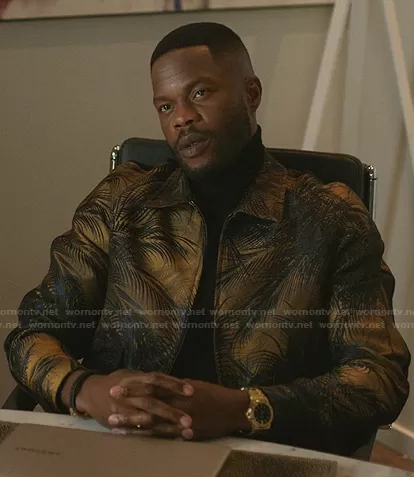 Jeff Colby (played by Sam Adegoke) on Dynasty on The CW was spotted wearing this palm tree print bomber jacket on Dynasty on episode 'Go Rescue Someone Else' (4x13) in Aug 2021. Jeff's Jacket is the Slim-Fit Metallic Jacquard Bomber Jacket by Saint Laurent.