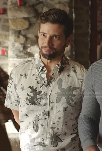 Sam Flores (played by Rafael de la Fuente) on Dynasty on The CW was spotted wearing this white printed short sleeve shirt on Dynasty on episode 'Go Rescue Someone Else' (4x13) in Aug 2021. Sam's Shirt is the Short Sleeve Hawaiian Shirt by Thom Browne.