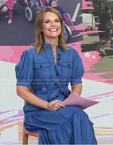 Savannah Guthrie on Today on NBC was spotted wearing this blue puff sleeve tie waist dress on Today on Apr 08 2022's episode. Savannah's Dress is the Buffy Utility Dress in Indigo by Derek Lam 10 Crosby.