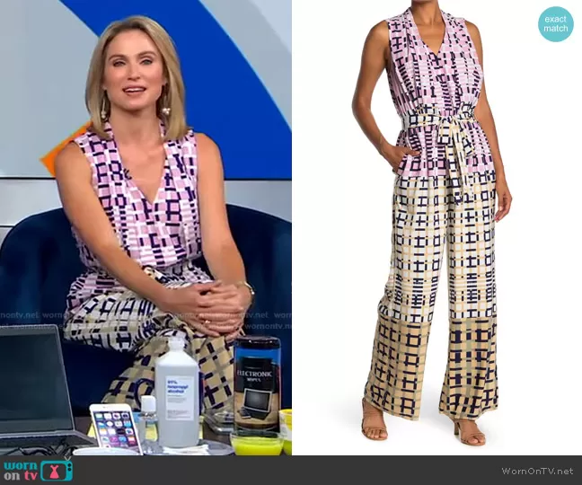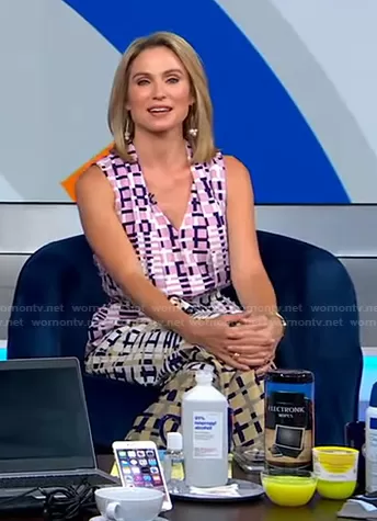 Amy Robach on Good Morning America on ABC was spotted wearing this mixed check print jumpsuit on Good Morning America on Aug 10 2021's episode. Amy's Jumpsuit is the Rhiann Jumpsuit by Adelyn Rae . Amy's Earrings is the Pearl Drops by Accessory Concierge.