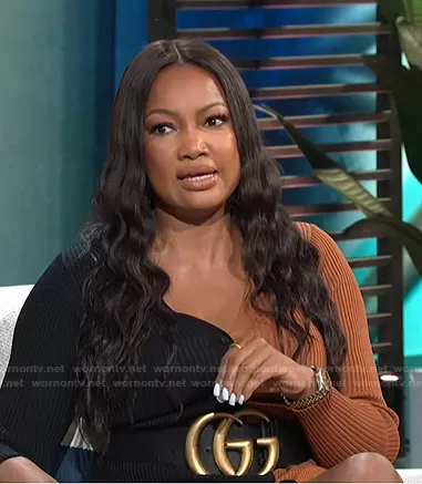on E! News on E! was spotted wearing this Garcelle’s black and brown ribbed dress on E! News Daily Pop on Aug 11 2021's episode. 's Dress is the Shoko Dress in Black & Tan by Staud . 's Belt is the Wide Weather Belt with Double G by Gucci.