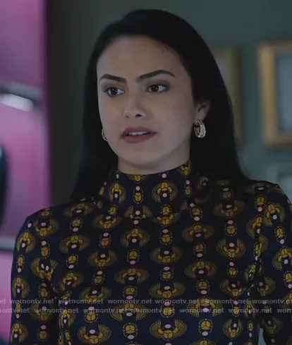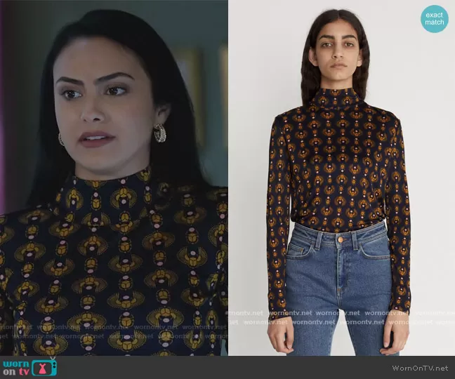 Veronica Lodge (played by Camila Mendes) on Riverdale on The CW was spotted wearing this printed mock neck top on Riverdale on episode 'Strange Bedfellows' (5x11) in Aug 2021. Veronica's Top is the Gellert Top by Rodebjer.
