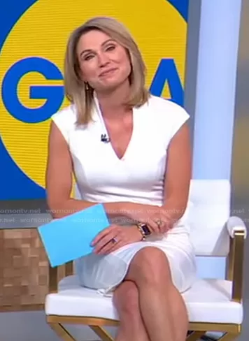 Amy Robach on Good Morning America on ABC was spotted wearing this white v-neck sheath dress on Good Morning America on Aug 12 2021's episode. Amy's Dress is the Katrina Dress by Alexia Admor.
