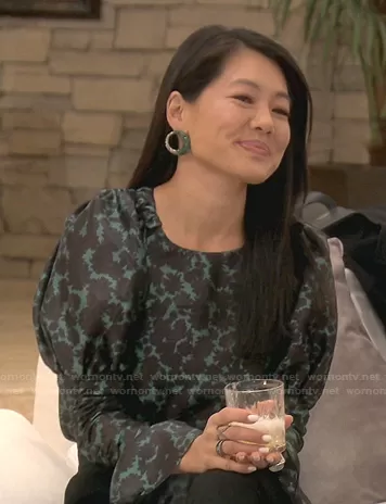 Crystal Kung Minkoff on The Real Housewives of Beverly Hills on Bravo was spotted wearing this black and green floral top on The Real Housewives of Beverly Hills on episode 'Circle of Distrust' (11x12) in Aug 2021. Crystal's Top is the Taffeta Sleeve Drama Blouse by Topshop.