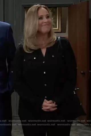 Laura Collins (played by Genie Francis) on General Hospital on ABC was spotted wearing this black button down blouse on General Hospital on Aug 13 2021's episode. Laura's Top is the Textured Roll-Tab Blouse by Calvin Klein.