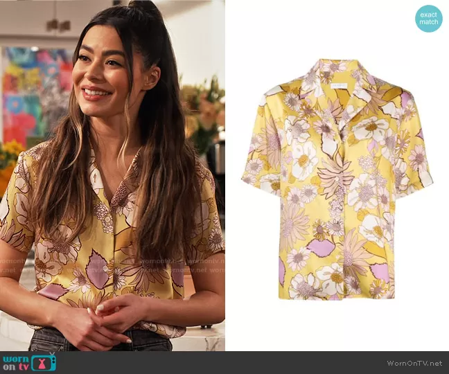 Carly Shay (played by Miranda Cosgrove) on iCarly on Paramount+ was spotted wearing this yellow floral button down top on iCarly on episode 'iCan Fix It Myself' (1x11) in Aug 2021. Carly's Top is the Printed pajama shirt by Sandro.