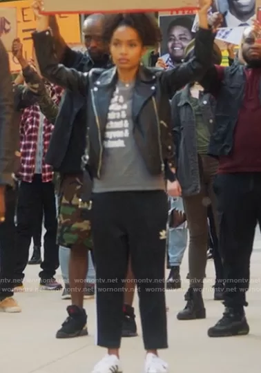 Zoey Johnson (played by Yara Shahidi) on Grown-ish on Freeform was spotted wearing this black Adidas track pants on Grown-ish on episode 'Put Your Hands Where My Eyes Could See' (4x06) in Aug 2021.