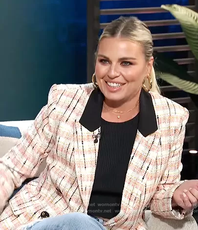on E! News on E! was spotted wearing this tweed plaid blazer on E! News Daily Pop on Aug 13 2021's episode. 's Blazer is the Jana Blazer by Ronny Kobo.