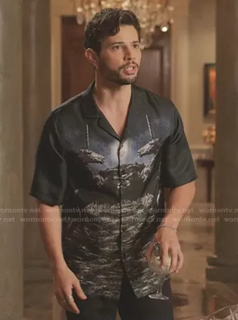 Sam Flores (played by Rafael de la Fuente) on Dynasty on The CW was spotted wearing this black unicorn print shirt on Dynasty on episode 'But I Don't Need Therapy' (4x14) in Aug 2021. Sam's Shirt is the Rockwood Unicorn Meadow Print Silk Bowling Shirt by Burberry.