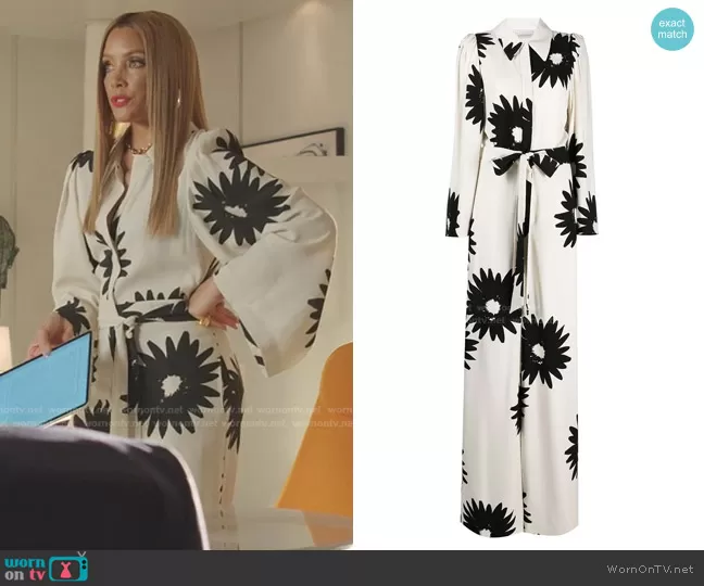 Dominique Deveraux (played by Michael Michele) on Dynasty on The CW was spotted wearing this white floral jumpsuit on Dynasty on episode 'But I Don't Need Therapy' (4x14) in Aug 2021. Dominique's Jumpsuit is the Elle Wide-Leg Jumpsuit by Stella McCartney.