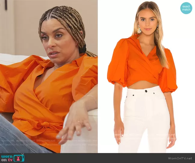 Robyn Dixon on The Real Housewives of Potomac on Bravo was spotted wearing this orange wrap blouse on The Real Housewives of Potomac on episode 'Land of the Free, Home of the Shade' (6x06) in Aug 2021. Robyn's Top is the Cellini Blouse by Petersyn.