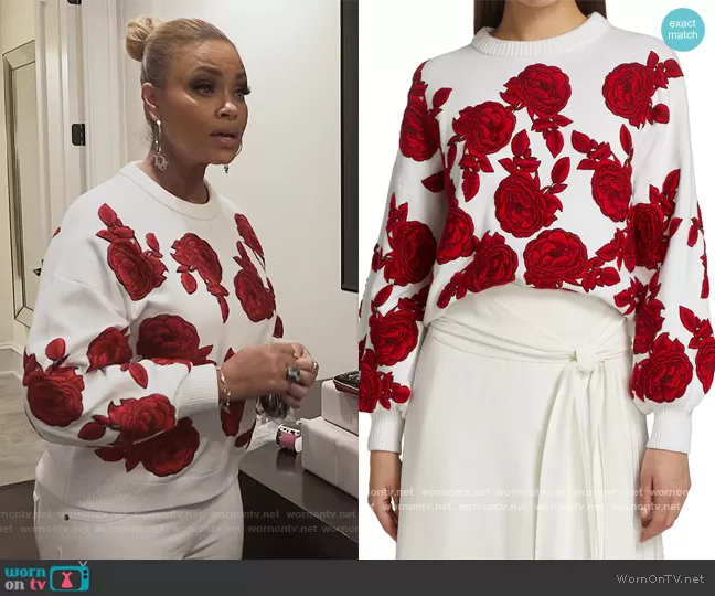 Gizelle Bryant on The Real Housewives of Potomac on Bravo was spotted wearing this white rose embroidered sweater on The Real Housewives of Potomac on episode 'Land of the Free, Home of the Shade' (6x06) in Aug 2021. Gizelle's Sweater is the Carwen Embroidered Balloon-Sleeve Knit Sweater by Alice + Olivia.